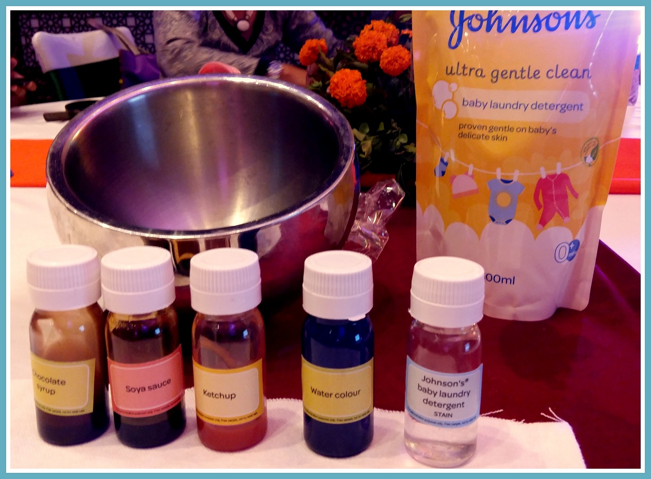 3) To soil a piece of cloth with water colours, soy sauce, ketchup and chocolate sauce and then wash them using the new Johnson’s baby detergent.