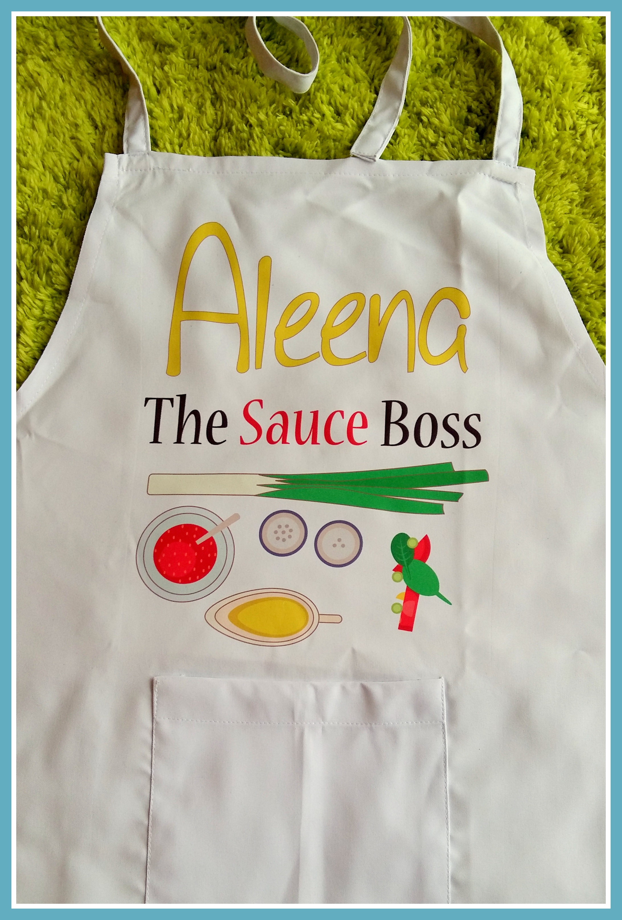 This pretty apron with a quirky message, Aleena – The Scauce Boss is of great quality and perfect size. I wish they also had a chef’s cap as accompaniment to this.